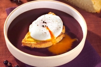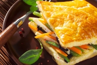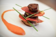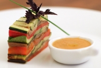 Napoleon od hrskave šunke serano i kandiranih patlidžana, coulis Of piquillo pepper
